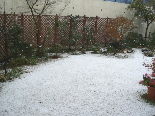 降りゆく雪が、シャッタースピードの関係で線のように見えてます。