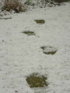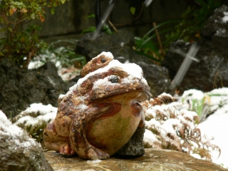 ↑雪の日も見守ってくれている庭の主・親子蛙